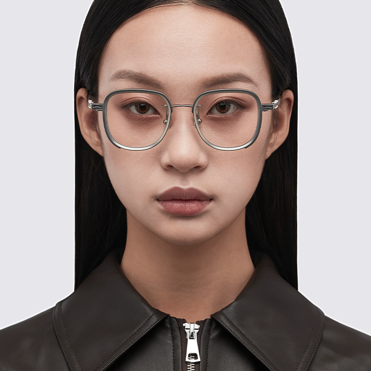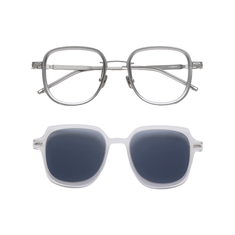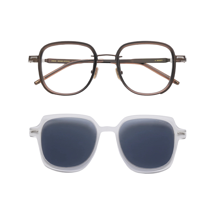 This classic stainless-steel rectangle shape fits all face shapes and available in Silver frames with Crystal acetate clip-ons, Black frames with Black acetate clip-ons, Brown frames with Crystal acetate clip-ons.