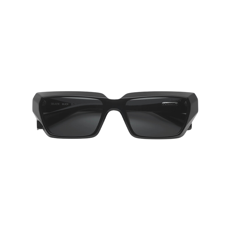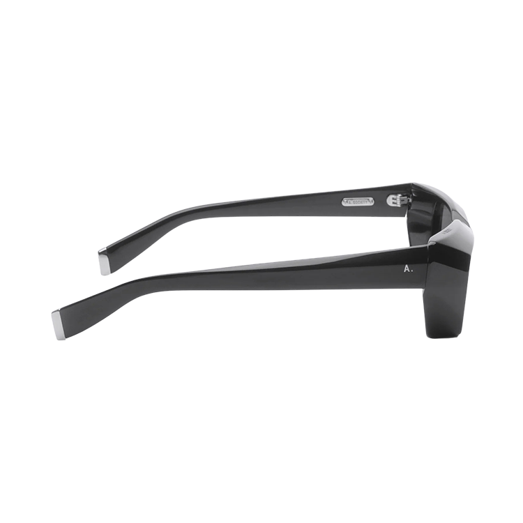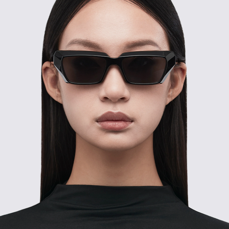 Part of the 2024 collection, these bold rectangular shape features beveled edges, thick temples and a spoiler on top of the frame and available in Black matched with dark Grey lenses.